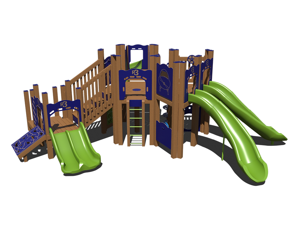 These commercial recycled playgrounds are an ideal option for nature play areas, as well as coastal environments. They feature 6” posts, utilize 42” decks, and can have a deck height of up to 8’. We offer our recycled playgrounds for ages 6 months to 12 years. These structures are popular choices for church playgrounds and HOA playgrounds as they easily blend into existing environments and are made to last.