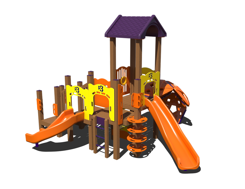 Our recycled playground decks and posts are available in three different colors: cedar, dark brown, and gray (at an upcharge). We offer recycled play structures for children of all ages, with or without theming, and with accessible ramps. Browse our eco-friendly playgrounds below or contact us to create a custom recycled play structure!